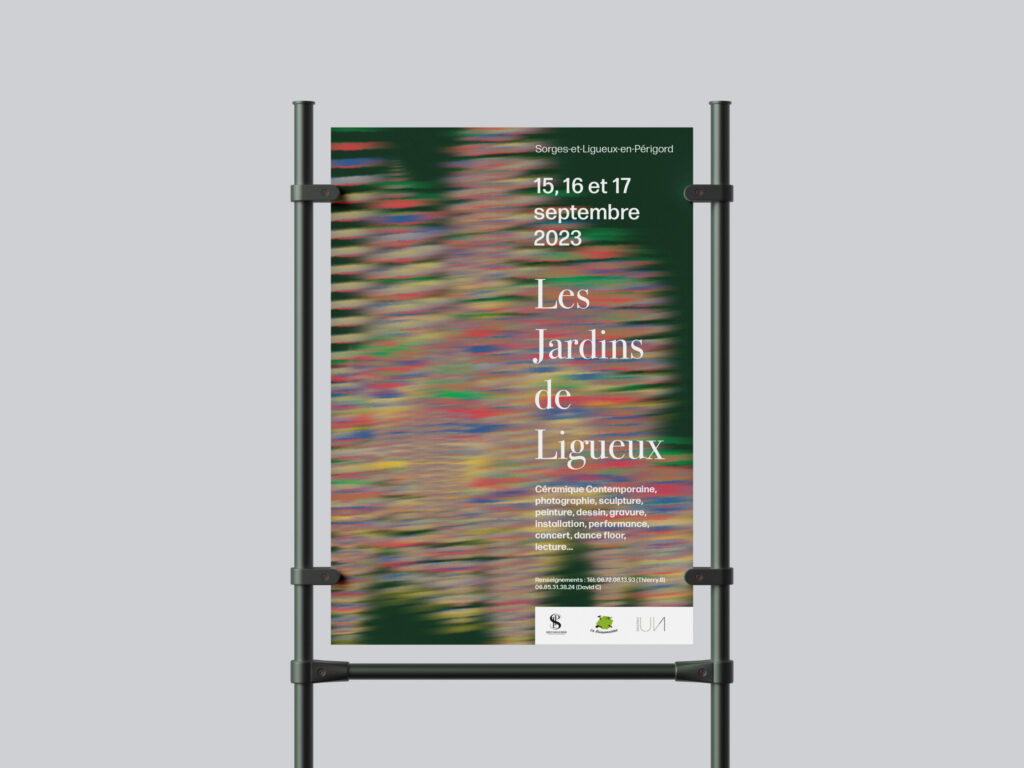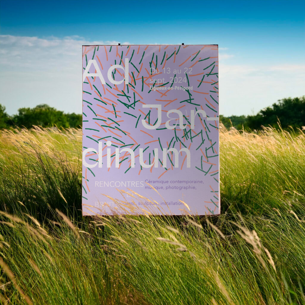 L’affiche pour cet événement éphémère se veut discrète et énigmatique. Elle met en scène un paysage de jardin avec des éléments naturels, où des formes artistiques, incluant la céramique, se fondent doucement dans l’environnement. Les détails de l’événement, tels que la date et le lieu, sont présentés en bas de l’affiche de manière sobre, sans trop d’ornementation.